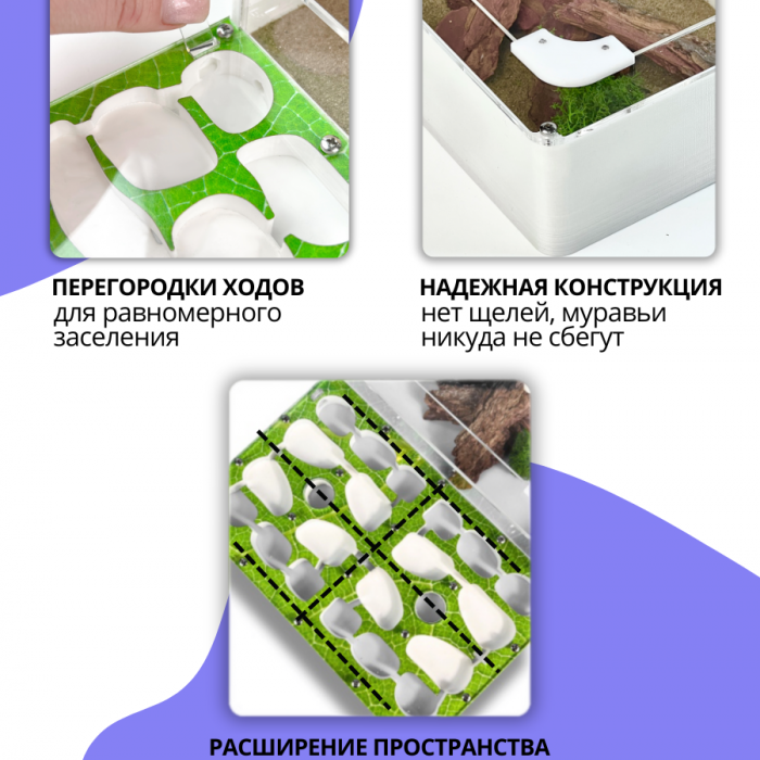 Для этого наш отдел качества следит за тем, чтобы у формикария была плотная крышечка, отсутствовали щели, и муравьи не могли выбраться погулять за пределы домика.